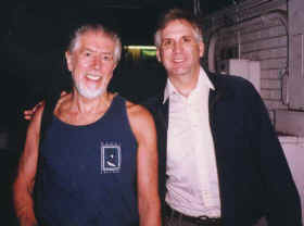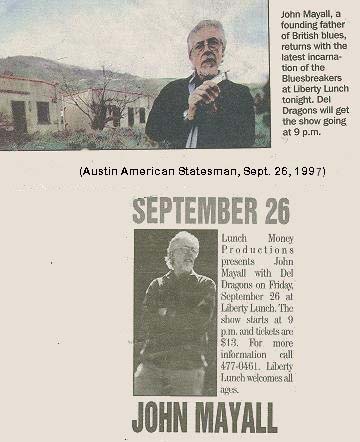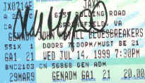 John Mayall is an elder statesmen of British blues music. Many a famous musician is a product of his early Bluesbreakers, including Eric Clapton. | Yours truly and the great John Mayall outside Jaxx, Springfield, Virginia July 14, 1999. | Click the autographed ticket or here to see awesome photos from John's July 14, 1999 Springfield, Virginia show. |